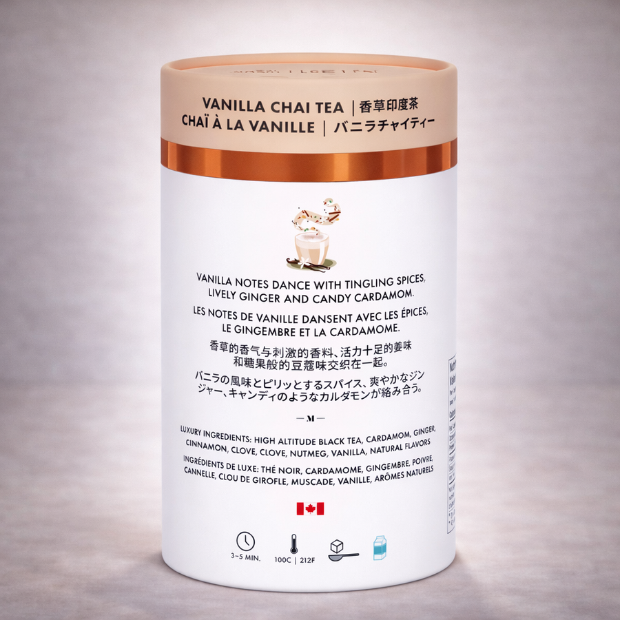 Our Luxury Vanilla Chai Tea is small-batch blended and carefully packed in Canada. Packaged in a paper-based canister with 24 plant-based luxury pyramid tea bags, both of which are naturally compostable. Our commitment to sustainability ensures that every cup is both indulgent and eco-friendly, from field to cup.Certifications: Certified Kosher and Vegan